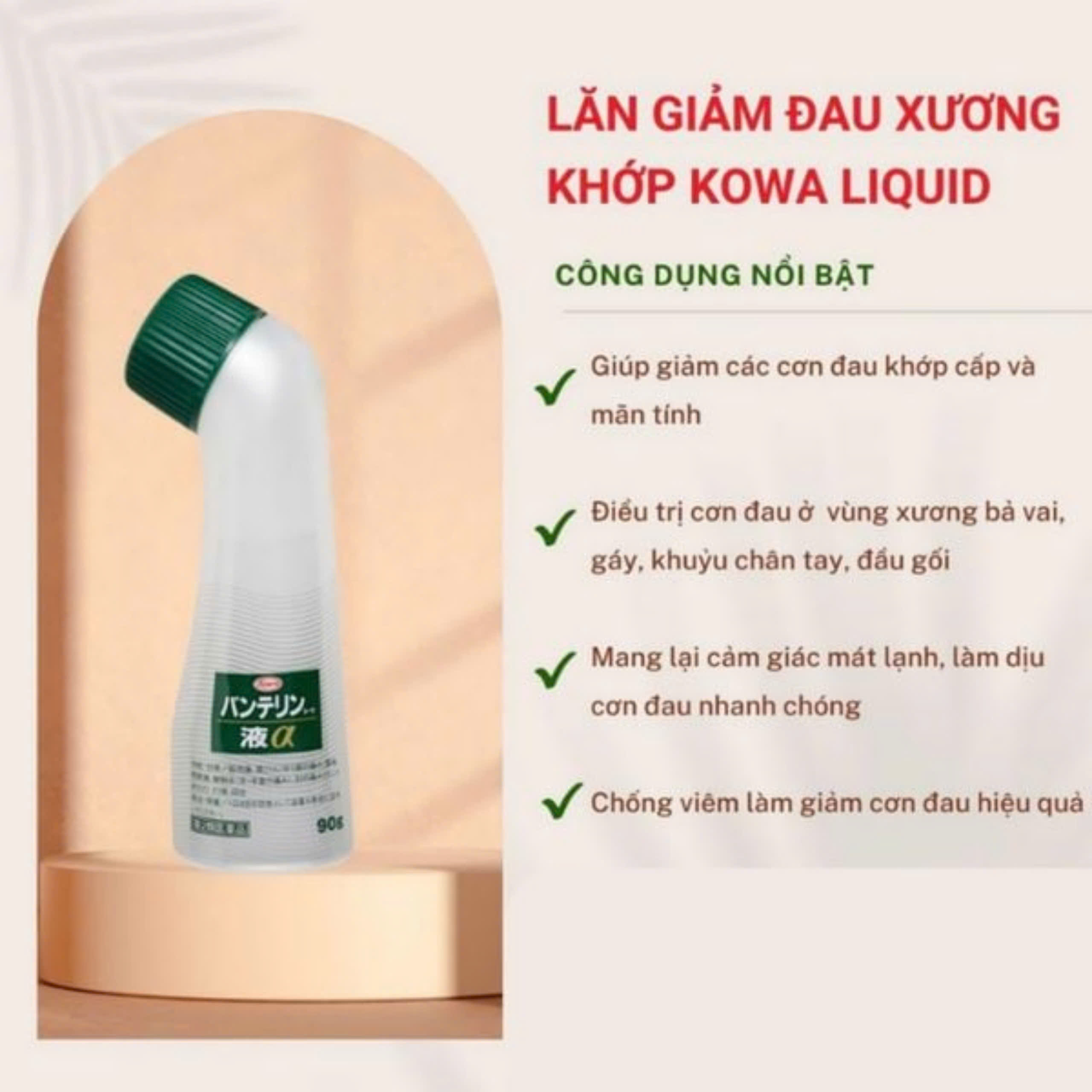 Lăn giảm đau xương khớp Vantelin Kowa Alpha 90g là một sản phẩm được sản xuất bởi Kowa Co., Ltd., Nhật Bản, nổi bật với tác dụng giảm đau hiệu quả cho các vấn đề về xương khớp như viêm khớp, đau nhức cơ bắp, đau lưng, đau vai gáy, và các triệu chứng đau khác liên quan đến các vấn đề cơ xương khớp. Đây là một sản phẩm dạng lăn, dễ sử dụng, rất tiện lợi cho việc áp dụng tại các khu vực đau nhức trên cơ thể mà không cần phải chạm trực tiếp vào da.