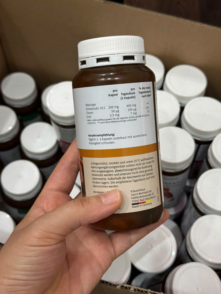 Zimt-Kapseln mit Chrom und Zink là viên uống bổ sung đến từ thương hiệu nổi tiếng Kräuterhaus Sanct Bernhard (Đức), giúp hỗ trợ ổn định đường huyết và tăng cường khả năng chuyển hóa năng lượng trong cơ thể.