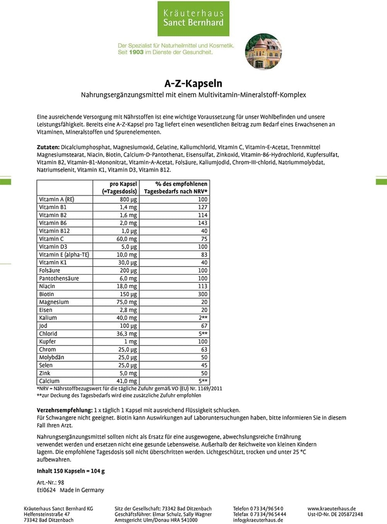 Viên uống tổng hợp A-Z Sanct Bernhard là sản phẩm bổ sung vitamin và khoáng chất thiết yếu giúp hỗ trợ tăng cường sức khỏe và duy trì năng lượng cho cơ thể mỗi ngày. Sản phẩm đến từ thương hiệu nổi tiếng của Đức Sanct Bernhard, được nhiều người tin dùng nhờ chất lượng đạt tiêu chuẩn châu Âu.